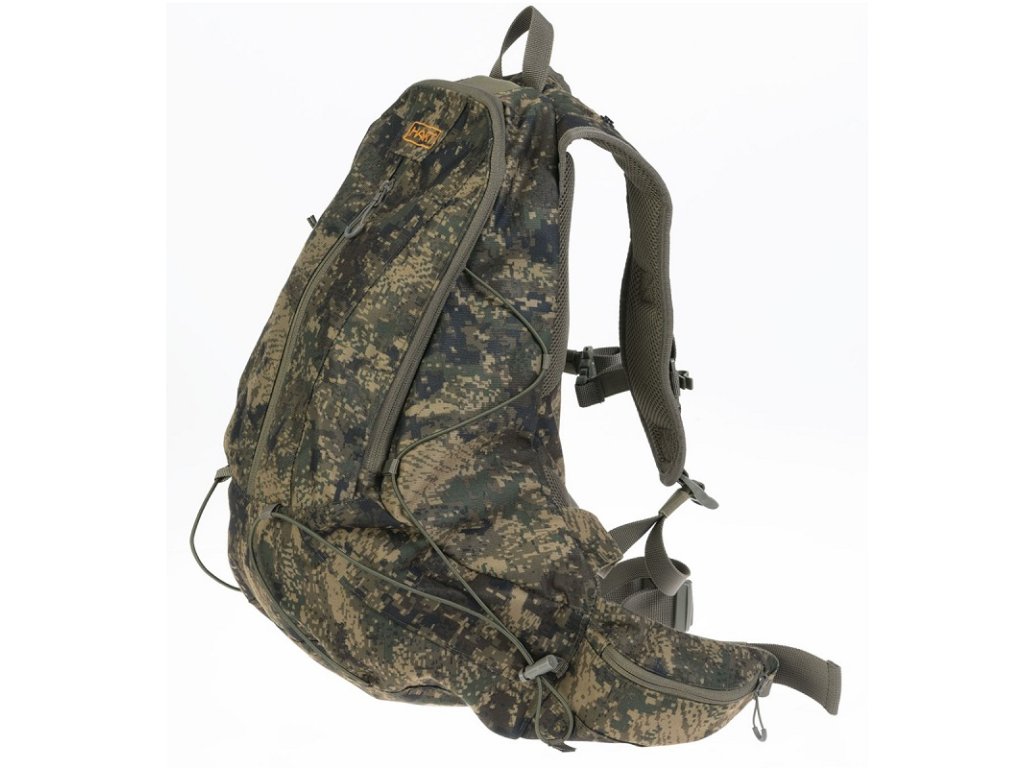 Vodotěsná, lehká, pevná a super tichá maskovací tkanina se kterou vaše vybavení zůstane v suchu i při nepříznivém počasí. Batoh s velkým otvorem a přihrádkou na vodní vak. Přední kapsa a dvě boční přihrádky jsou na zip. K distopozi jsou šňůrky pro dodatečné zatížení. Batoh má pěnový prodyšný polstrovaný zadní systém, nastavitelné popruhy a pás.