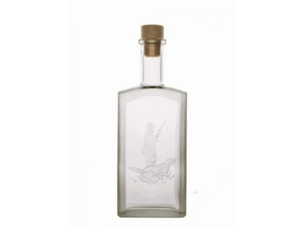 Hranatá láhev o objemu 0,5 l z broušeného skla s motivem myslivce a loveckého psa.