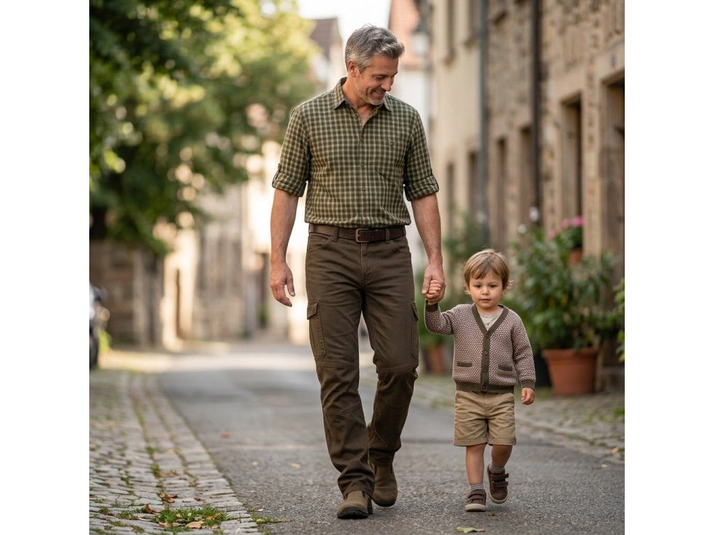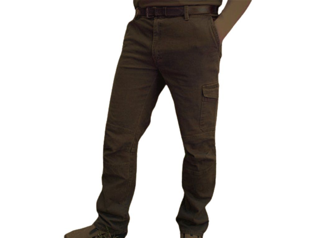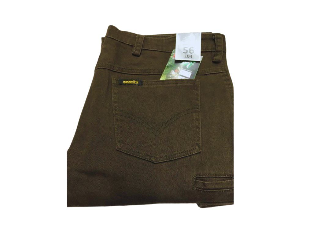 Hnědé džíny s postranními kapsami. Prostorné kapsy na nohavicích mají klopu se zapínáním na knoflík. Na předních dílech jsou dvě klasické průhmatové kapsy a na zadním díle další dvě kapsy a kapsa na nůž.