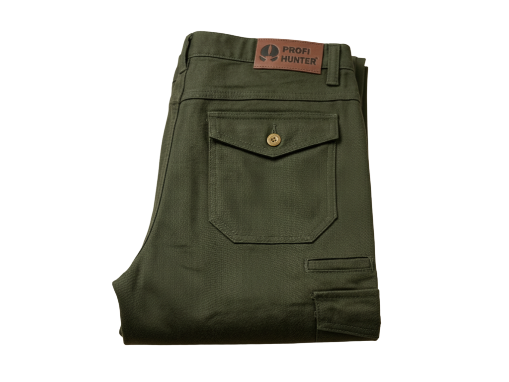 Zelené džíny z pružného hrubšího materiálu. Kapsy na nohavicích jsou prostorné a mají klopu se zapínáním na knoflík. Na předních dílech jsou dvě klasické průhmatové kapsy a na zadním díle další dvě kapsy a kapsa na nůž.