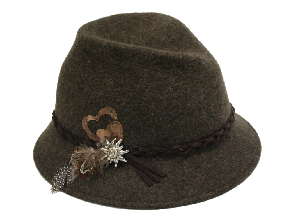 Dámský klobouk zdobený protěží, srdíčky a peřím.materiál: 100% vlna