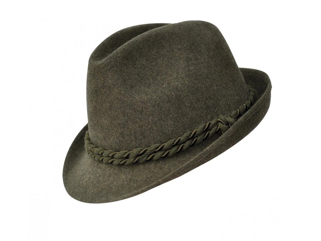Myslivecký klobouk Hugo ze 100 % vlněné plsti klasického tvaru, je zdobený bavlněnou splétanou dvoubarevnou šňůrou.