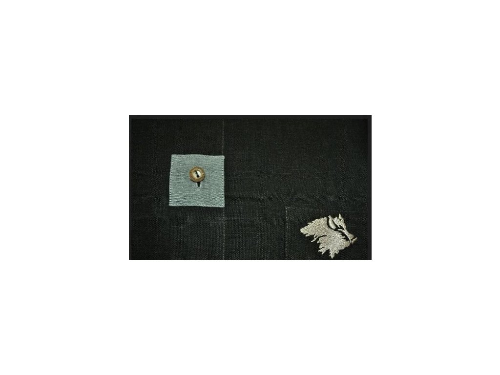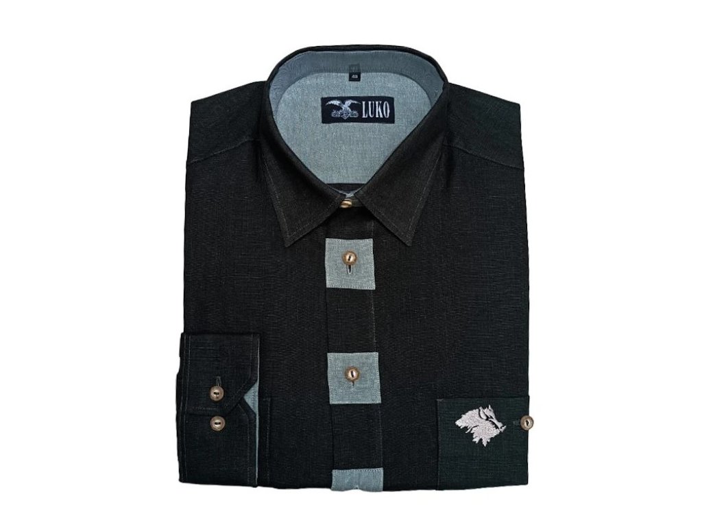 Černá pánská lněná košile s dlouhým rukávem s výšivkou kance na levé kapse a parohovými knoflíčky. Materiál pod knoflíčky je zpevněn materiálem kontrastní barvy.