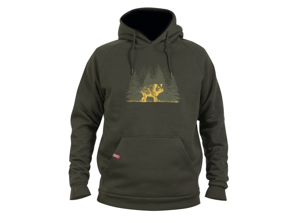 Teplá unisex mikina - klokanka přes hlavu s kapucí a motivem divočáka.