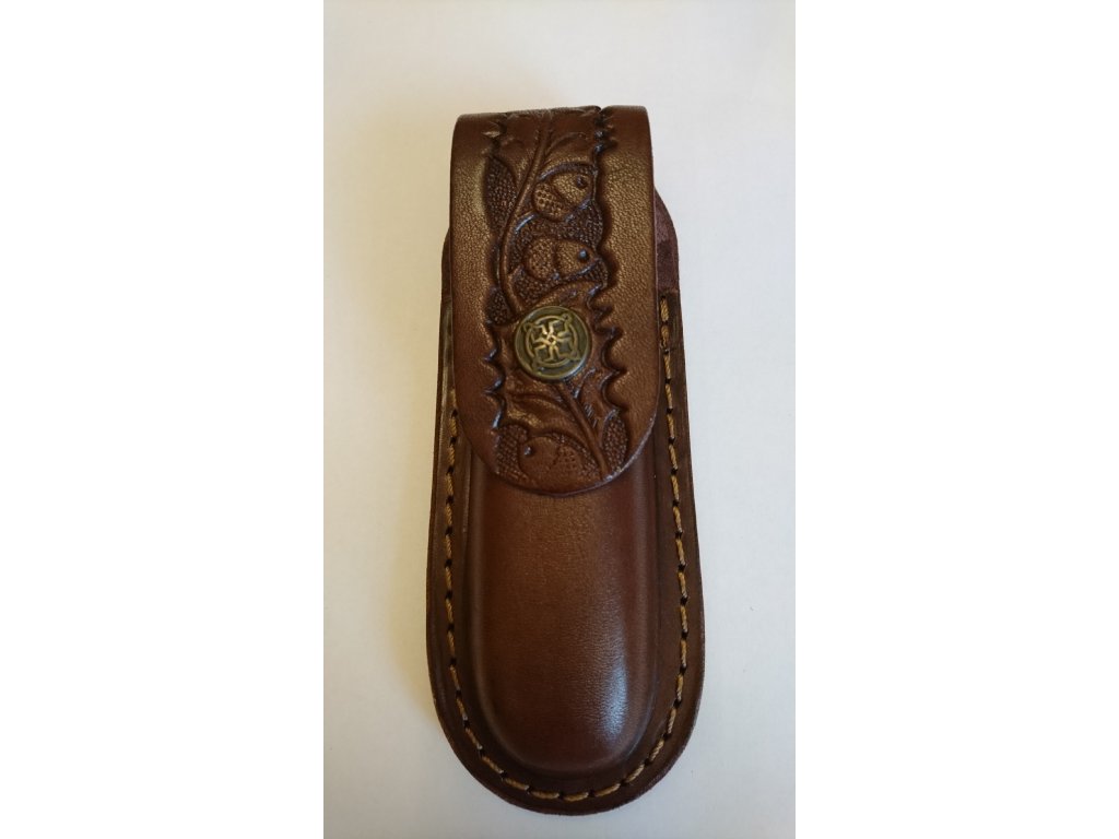 Kožené pouzdro na zavírací nůž o délce 130 mm (v zavřeném stavu) se čtyřmi až pěti vrstvami želízek.