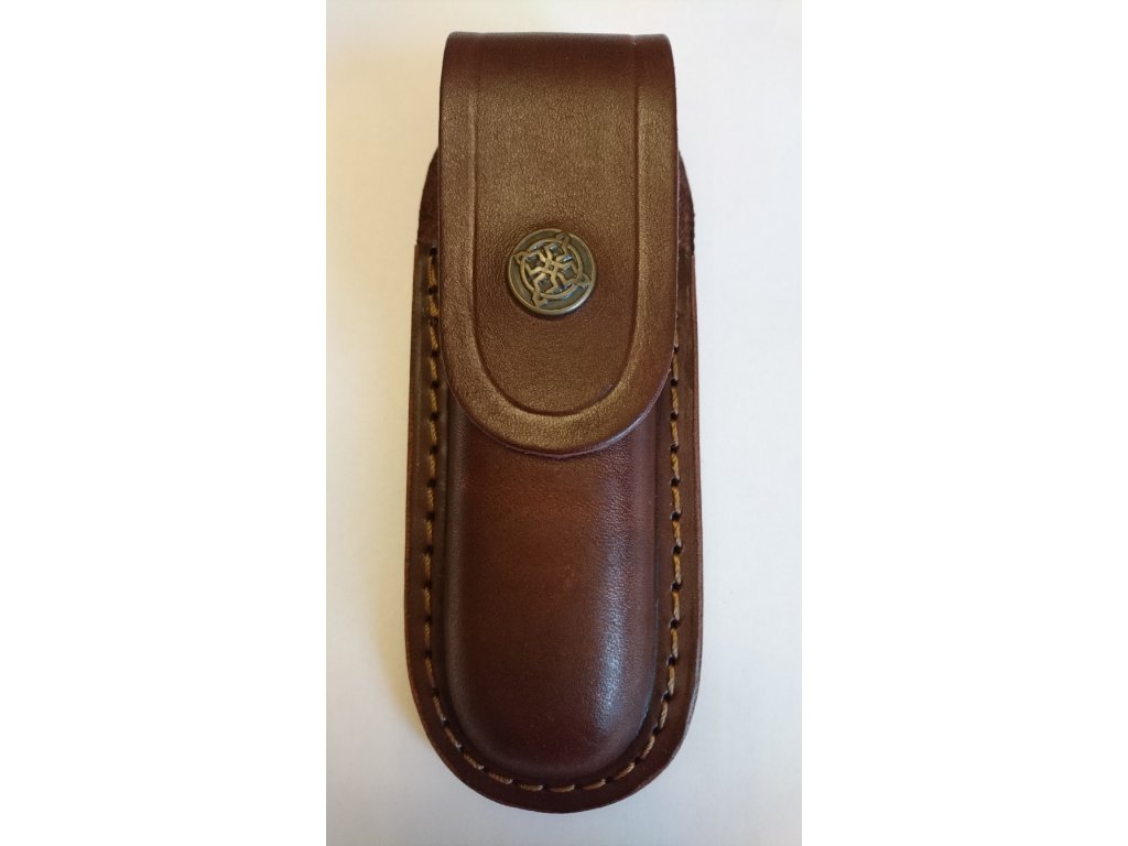 Kožené pouzdro na zavírací nůž Victorinox o velikosti 90 mm (v zavřeném stavu) se dvěma až třemi vrstvami želízek.