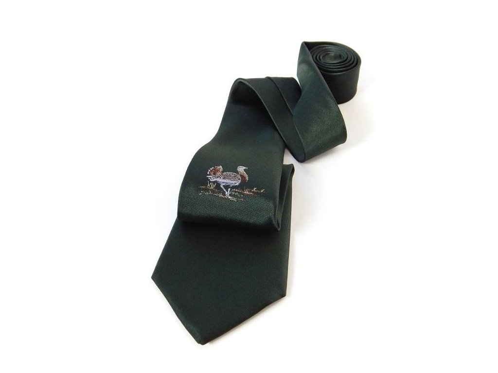 Vázanka HEDVA s mysliveckým motivem dropů. Kravata se hodí ke klasickému límečku košile či k širší klopě u saka.