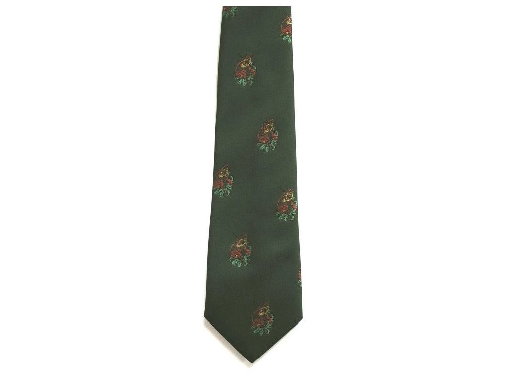 Vázanka HEDVA s mysliveckým motivem klobouku a pušky.Kravata se hodí ke klasickému límečku košile či k širší klopě u saka.