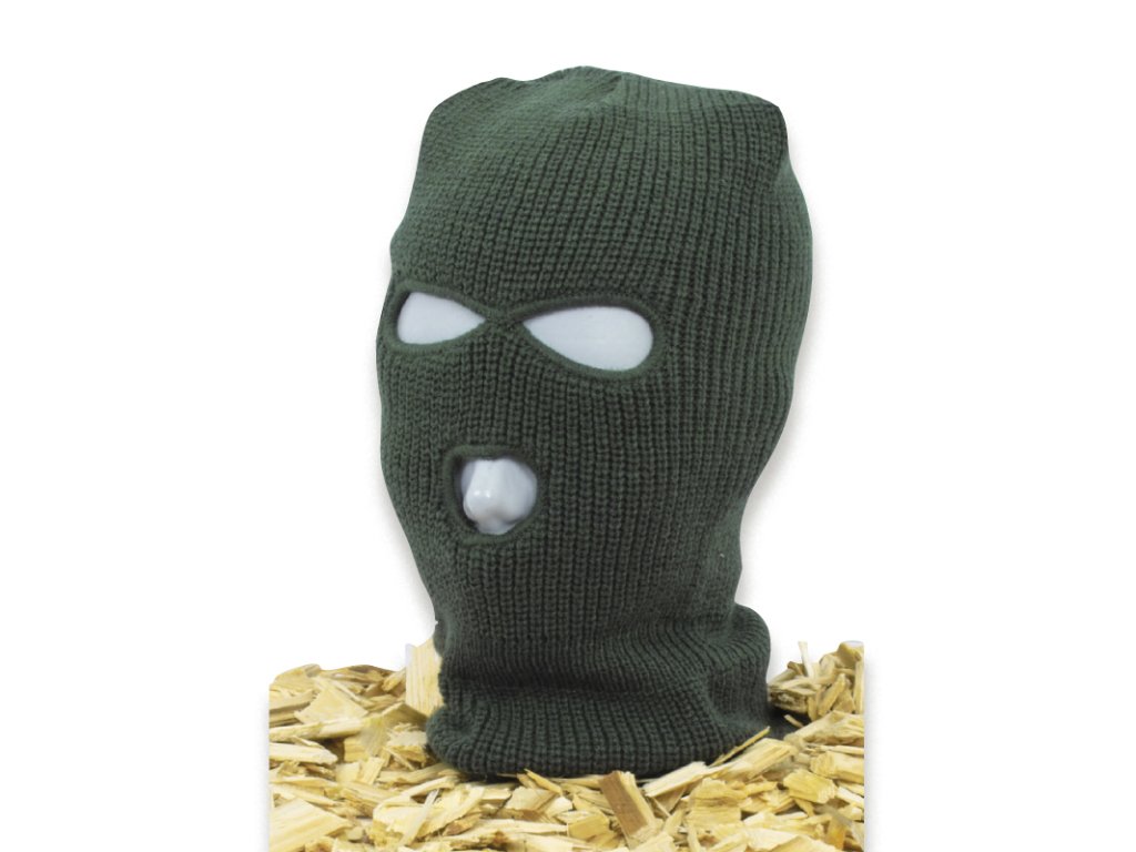 Pletená kukla z polyakrylu se třemi otvory pro nos a oči chrání obličej a celou hlavu před chladem a větrem při outdoorových aktivitách v zelené barvě.
