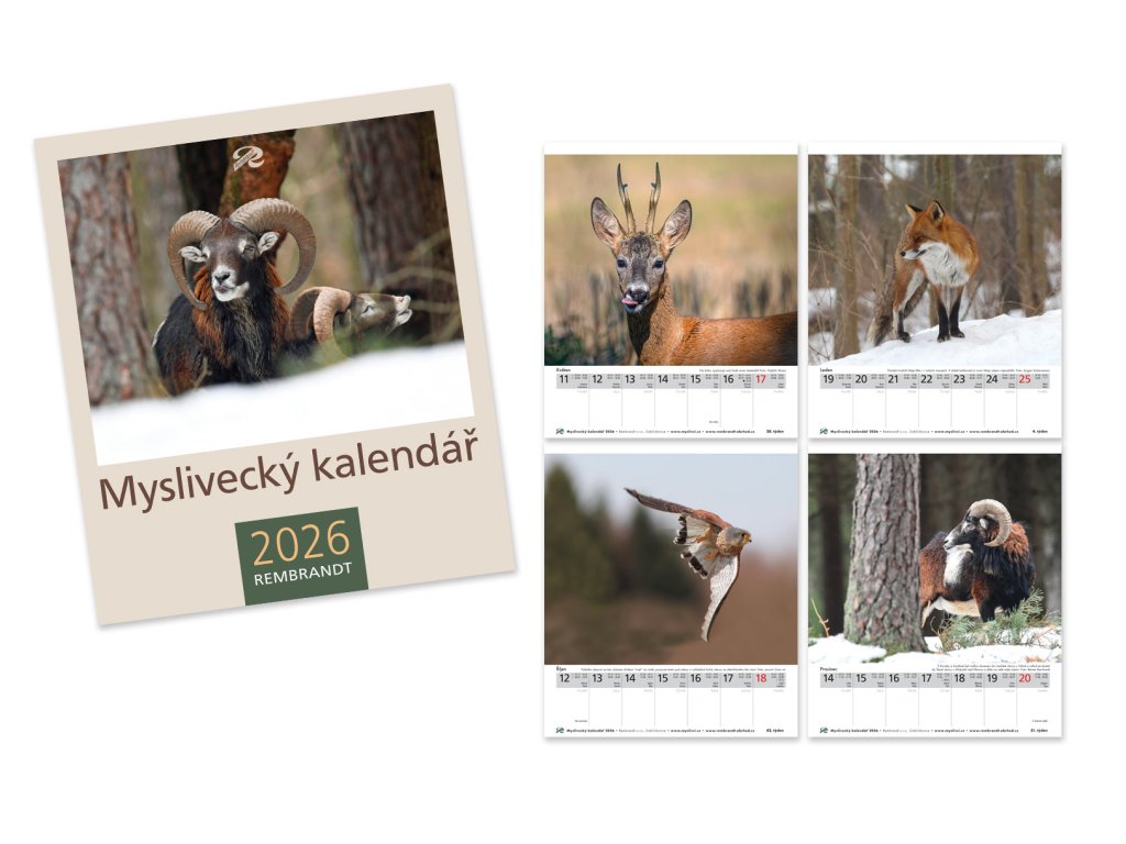 Týdenní myslivecký kalendář na rok 2026, obsahuje 54 mimořádných fotografií zvěře, od domácích i zahraničních fotografů. Kalendář s českým kalendáriem, s jmennými svátky, východy a západy Slunce a Měsíce, včetně označení jednotlivých fází Měsíce a doby lovu zvěře. Díky vazbě kalendáře, lze kalendář používat jako nástěnný i stolní. V kalendáři je místo pro poznámky.