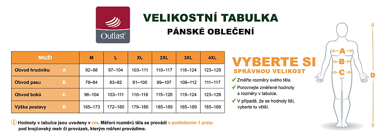 Materiál Outlast® udržuje stálou teplotu mezi pokožkou a prádlem, proto když se zahřejete, Outlast® teplo odebere dřív, než se pokožka začne potit. V případě ochlazení, Outlast® vašemu tělu naopak teplotu dodá.