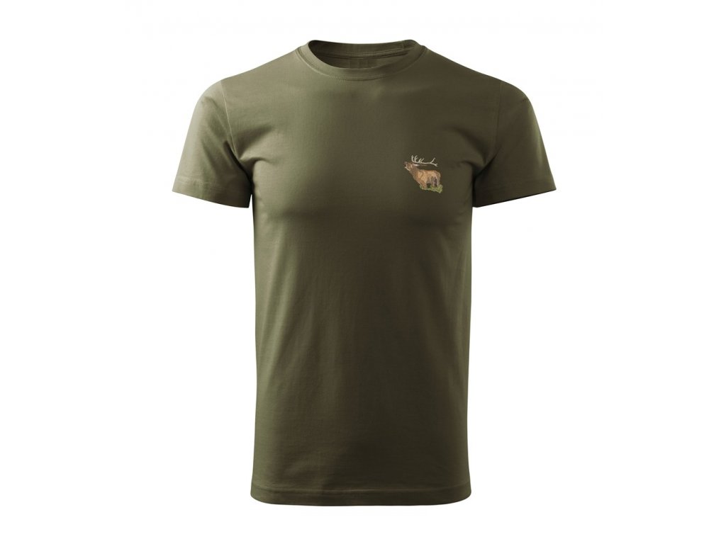 Bavlněné tričko s výšivkou jelena. Tričko je tvarově stálé bez bočních švů. Ramenní švy jsou dvakrát prošité. Materiál je ošetřen silikonovou úpravou pro snadnější údržbu trička. Žebrovaný úplet průkrčníku je s ohledem na tvarovou stálost s přídavkem elastenu.
