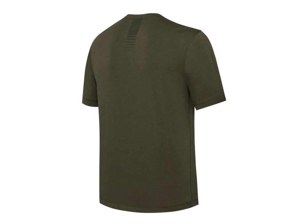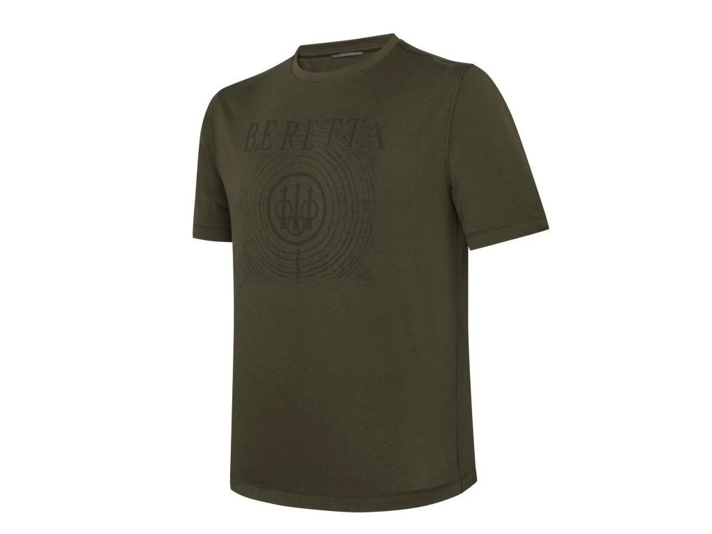 Pánské bavlněné tričko s logem Beretta přes téměř celý přední díl v tlumených tónech zelené. Loga Beretta je i přes svoji velikost nepříliš výrazné a tričko je tak vhodné i pro odpůrce nápisů a obrázků na tričkách. Drobnější vyobrazení loga je také na zadním díle hned pod průkrčníkem. Tričko je vyrobené z bavlny 180g/m2.