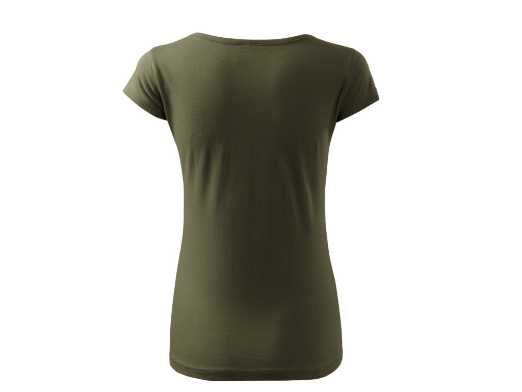 Bavlněné dámské tričko s krátkým rukávem, které je lehce vypasovaného střihu s bočními švy v zeleno-hnědé barvě. Rukávy jsou kratší než u klasického bavlněného trička. Ramenní švy jsou zpevněné páskou.